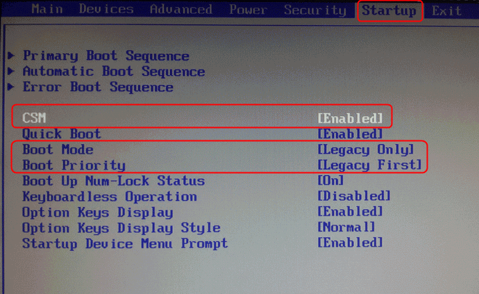 进入“Startup”,将“CSM”(兼容支持模块)设置成“Enabled”,将“Boot Mode”设置成“Legacy Only”,将“Boot Priority”设置成“Legacy First”。