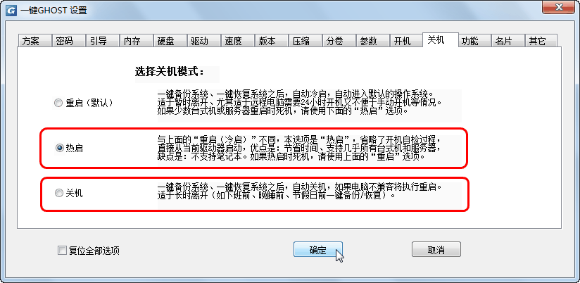 * 设置关机模式(2017版,增设"热启"选项,以解决少数电脑"重启"时死机问题)