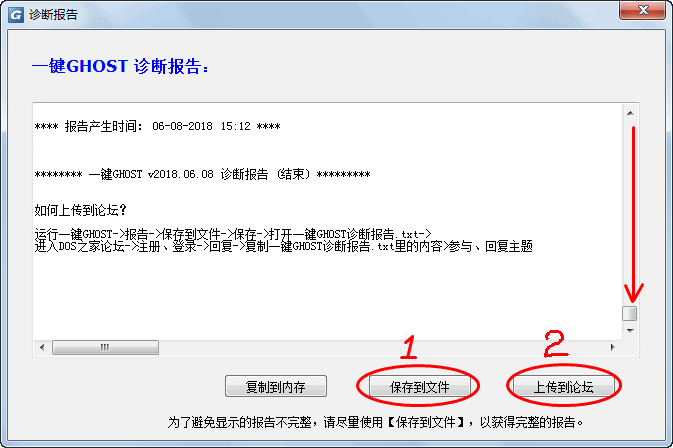 回复时,请复制“一键GHOST诊断报告.txt”里的全部内容后粘贴,以供大家帮助你分析原因和解决问题,也有利于软件的日后改进。