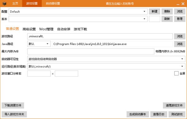 2、在这个页面可以设置java路径,内存大小等,同时后期加装Forge、LiteLoader、OptiFne等,也再此页面,选择自动安装。