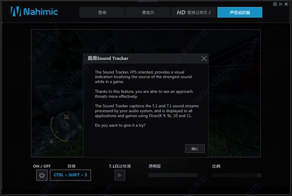 2、Nahimic2最为突出的在于全新的“声音追踪器”功能,要开启此功能需要我们在Nahimic2主界面点击“声音追踪器”选项进入声音追踪器的设置界面,进入该界面之后会出现一个英文弹窗,点击OK之后默认已经开启此功能