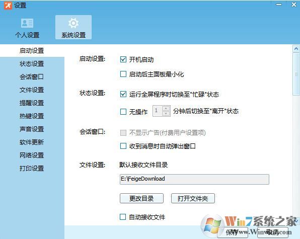 “系统设置”中可以修改开机启动项、文件默认接收目录和自动接收、消息提醒以及自动更新等选项,详细内容见下图: