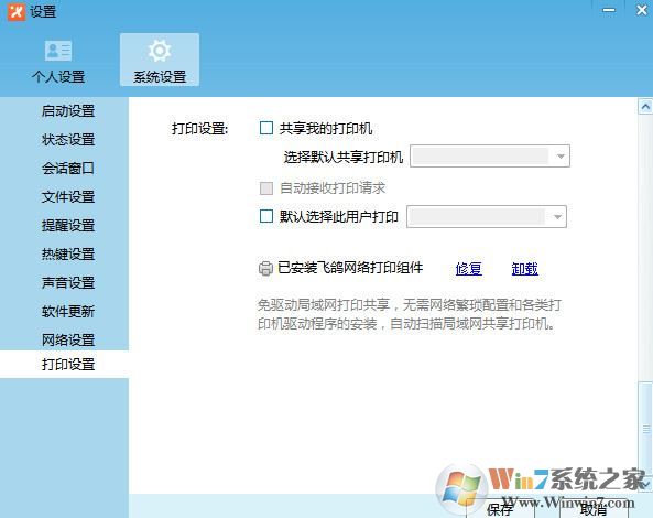 打印设置,用户在安装飞鸽网络打印组件后,可以选择共享已经连接的物理打印机,允许其他飞鸽用户(包括PC端用户和手机端用户)可以请求使用您的打印机进行打印,如图: