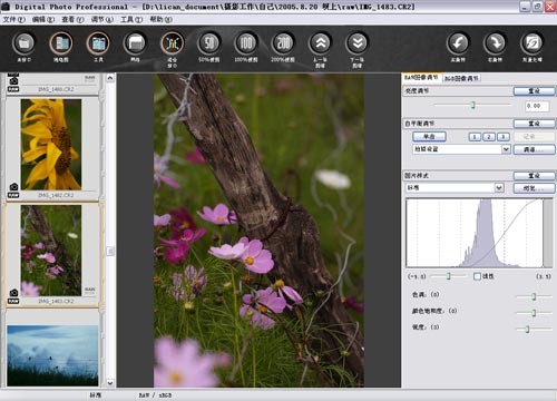 Digital Photo Professional的启动相当迅速,和其他几款RAW处理软件相比优势明显。缺省状态下,Digital Photo Professional采用“文件树(左)+缩略图(右)”的组织结构,顶部是工具按键栏和菜单栏。