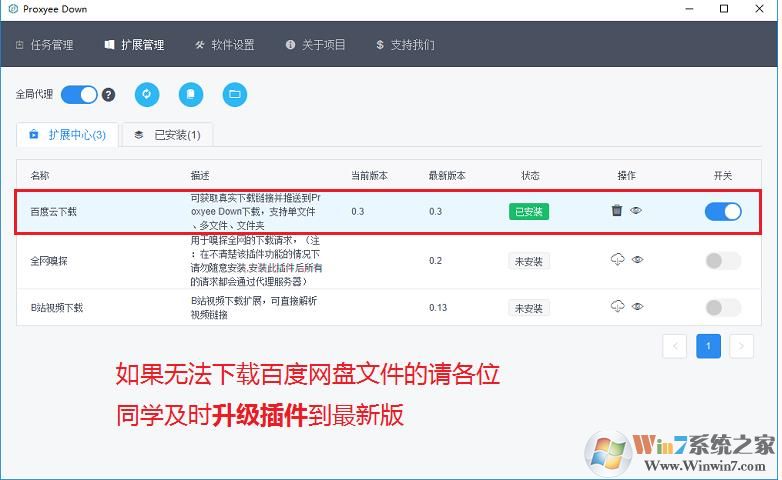 4、由于百度网盘经常的更新升级下载方法打击第三方下载器,如果出现百度网盘网盘文件无法下载的请各位同学及时的升级Proxyee Down 扩展插件到最新版即可解决