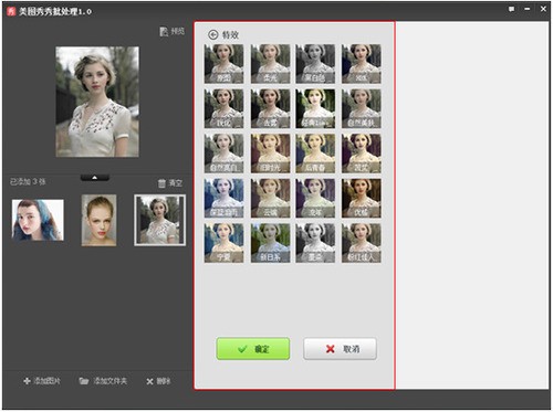 美图秀秀批处理提供有20多种特效,选择非常丰富。其中包括自然亮白,自然亮肤面向人像的处理特效,也包括锐化,去雾等基础调整类特效,剩余的更多是照片风格特效,比如LOMO、旧时光、后青春等等有12种之多。这些特效是精选的美图秀秀电脑版的热门经典特效,画质和效果出色,在与照片融合度上也有不错的表现。