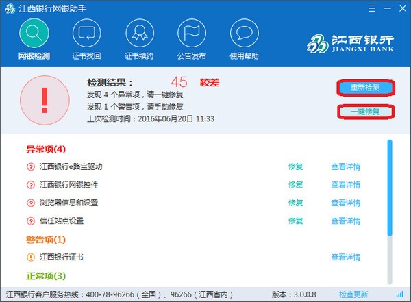 江西银行网银助手是一款帮助用户轻松检测电脑硬件环境是否能够能够正常访问网上银行的小工具,可以帮助用户一修复安装所有使用网银所需要的控件和驱动程序,在电脑上连接U盾选择对应的U盾型号后就会帮助我们安装驱动,安装完成后就可以正常访问江西银行网上银行了,进行登录、查询、转账等操作!