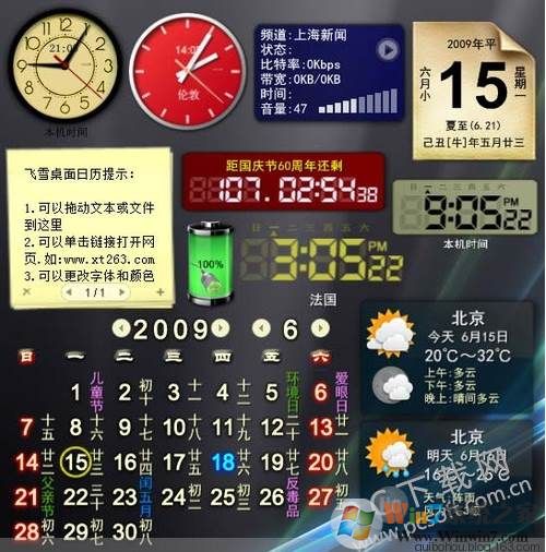2.更好的视觉体验。月历、日历、时钟、便签、网络电台等均至少能调配出16581375种色彩搭配,并最先采用分层透明度调节,确保与桌面背景良好的融合。