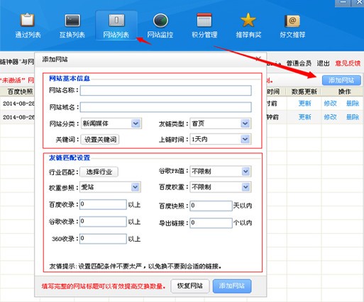 登陆“换链神器”进入“网站列表”点击“添加网站”并设置换链匹配条件,添加完网站后系统会在十分钟后自动更新所添加网站SEO数据,或者手工点击“更新”.