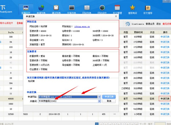 查看对方详细数据,觉得符合自己网站条件后,选择好申请交换的网站及关键词点击“申请交换”,系统会向对方发送弹窗提示。