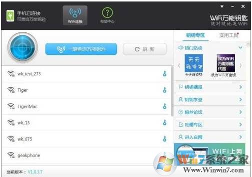 6.点击“一键查询万能钥匙”,用户分享过密码的热点会显示有蓝色钥匙标志,然后点击“自动连接”,如果未连接成功,可以尝试连接其他热点。