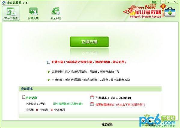 (一键诊断清除未知病毒)能够快速系统安全检测并强力清除已知顽固木马病毒,暴力删除未知木马如"超级av终结者"、扫荡波等病毒,并可以全面修复系统破坏项目。能够帮您修复因为病毒破坏而出现的系统异常。如不能复制粘贴,打印等系统问题。金山急救箱功能