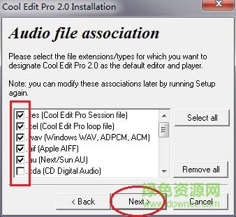 4.选择关联的音频文件格式,勾选后点击“next”;