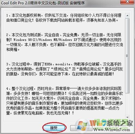 14.最后我们来汉化,打开“Cool2chinese.exe”文件,点击“接受”按钮;