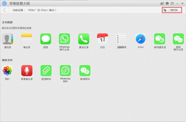 苹果恢复大师用于恢复误删除的iOS设备上的微信聊天记录、通讯录、短信、备忘录、通话记录、日历等数据,是全球第一款免费的数据恢复软件,能恢复三种模式下的多种数据,只需一键即可找回联系人,短信和照片等多达15种数据类型,是最顶尖的数据恢复软件。