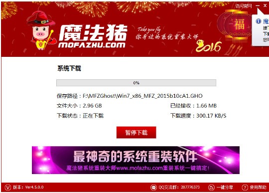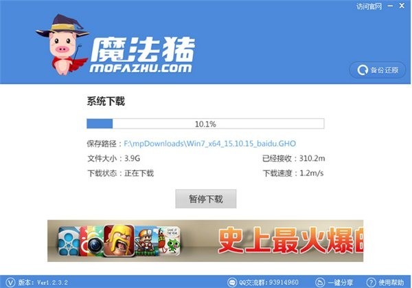 3.接着魔法猪系统重装大师会自动进行系统下载,根据网速不同下载完成的速度也不同,Win7系统一般在1小时内完成下载。