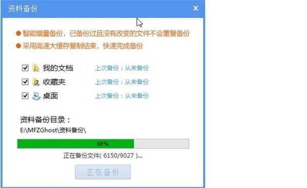 2.接着魔法猪会对您系统盘中的(一般系统盘为C盘)我的文档、收藏夹和桌面资料进行备份。备份的文件将会自动保存到您系统磁盘最大的分区中,名称为X:\MFZGhost\资料备份文件夹中。在下面的进度条中可以看到备份的进度,一般备份在1-2分钟之内就可以完成。完成后会自动进入下一步。