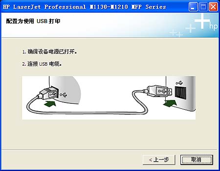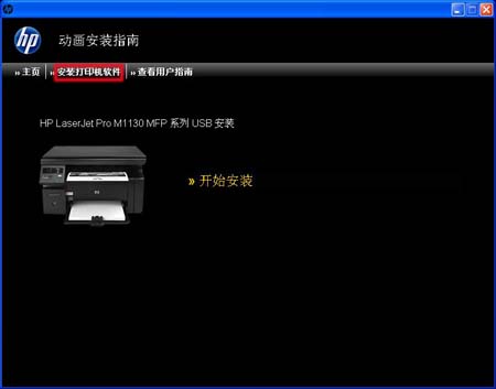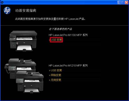 2.在“动画入门指南”窗口中,请在“HP LaserJet Pro M1130 MFP 系列”下,点击“USB 安装”按钮。如图USB 安装所示: