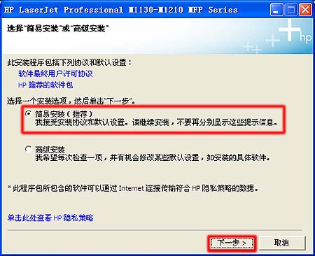 4.在“选择简易安装或高级安装”窗口中,点击“简易安装(推荐)”项,然后点击“下一步”按钮。如图简易安装所示: