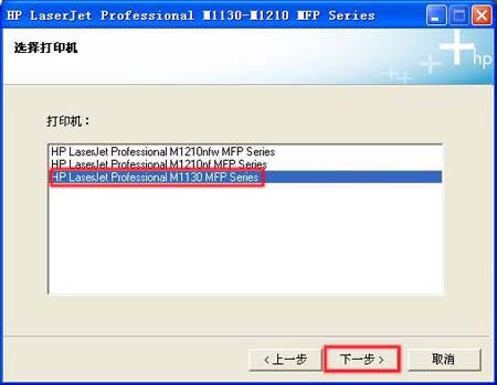 5.在“选择打印机”窗口中,选择“HP LaserJet Professional M1130 MFP Series”项,然后点击“下一步”按钮。如图选择打印机所示:
