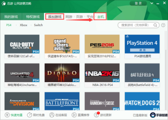1、添加游戏选择主机类标签 自行搜索加速游戏。(如果没有支持的游戏,可以选「PS4游戏通用」或者「Xbox游戏通用」或者「switch游戏通用」)