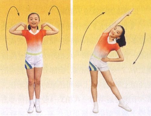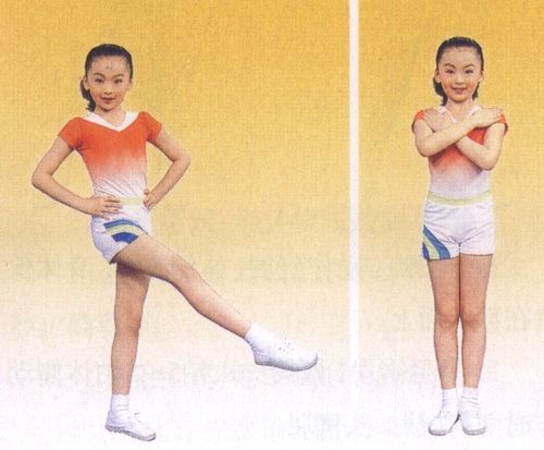 1-2两脚起落锺两次,同时两臂肩侧上屈,手指触肩。手要高过头 3-4两脚起落锺两次,同时两手胸前击掌两次。 5-6右腿屈膝,左腿侧伸脚跟着地,同时上体侧屈,梗头