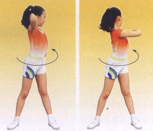 1-2成开立,两臂经侧上举,五指分开,于头上交叉两次 3-4左臂叉腰,右臂肩侧上屈,手扶头后。上体左转90° 5-6右手叉腰,左臂经前由最近点至前举,上体右转。 7-8还原成直立