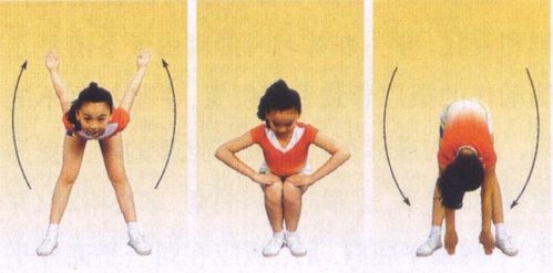 第三个八拍 1-2左脚向侧一步成开立(稍宽于肩),同时两臂体前交叉向外绕至侧上举(左臂在上)。 3-4体前屈,两臂经侧绕至前举,手指触地,(掌心向里)。 5-6左脚收回成全蹲,两手扶膝,稍抬头。 7-8还原成立正。