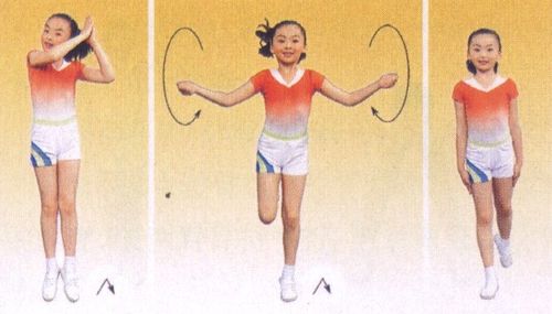1-2并脚跳两次,同时两臂胸前立屈,左肩上击掌两次,头稍左侧屈。 3-4同1 2但方向相反。 5-7右脚开始后踢腿跳,同时两臂体侧屈135度,向前绕环三周,握拳。 8还原成立正。
