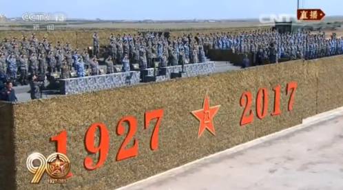 朱日和,这个蒙古语意为心脏、勇气和胆量的地方,烈日灼灼,碧野莽莽。检阅台前“1927—2017”字样和八一军徽在阳光下熠熠生辉。