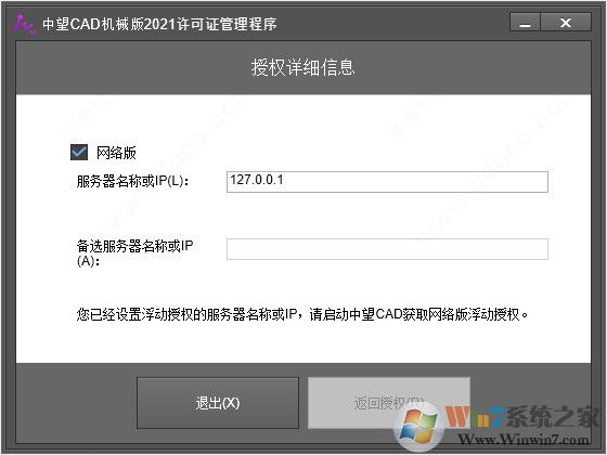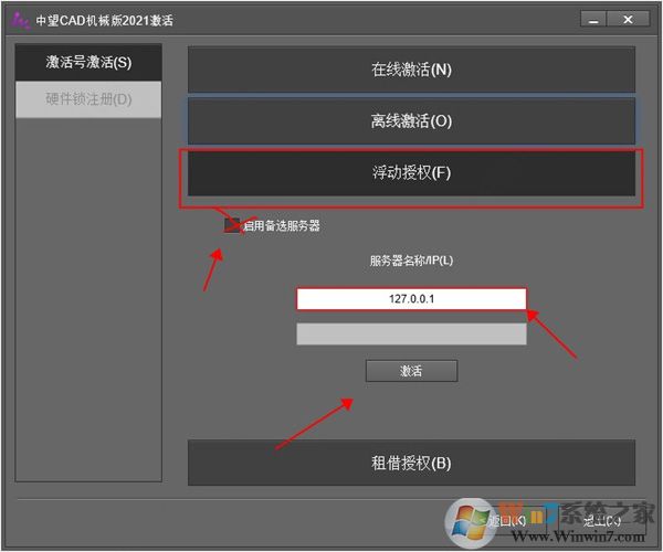 8、选择浮动授权,然后取消勾选启动备选服务器,服务器名称为:127.0.0.1,然后点击激活即可;