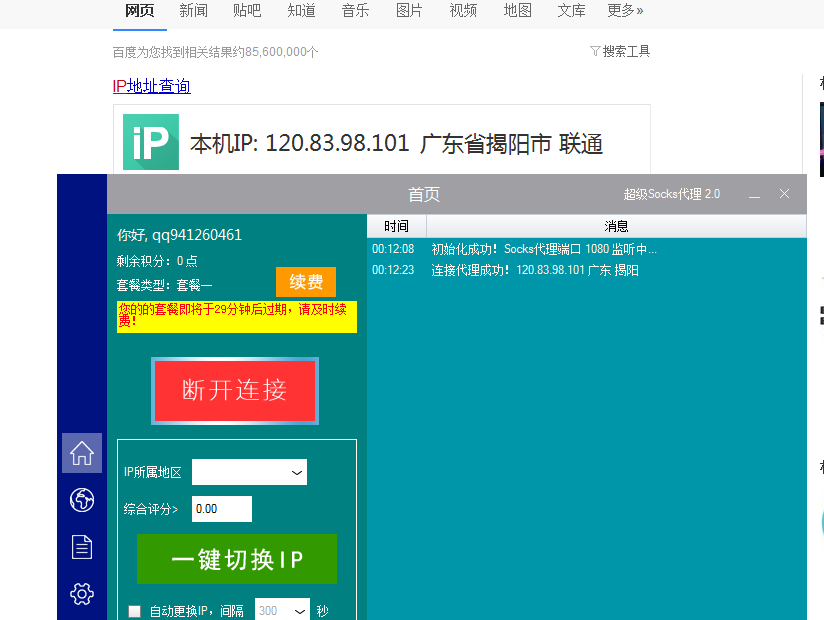 分享一款免费换IP软件,这款软件采用socks代理模式,让大家可以免费更换全国IP地址,这对一些注册、做活动时非常有效。注册送30分钟试用时间,时间到了继续去注册账号无限试用,注册账号也不需要验证,可以说2秒注册一个号吧。
