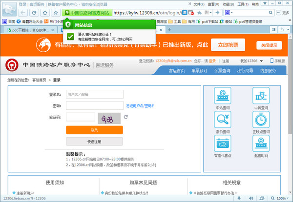 猎豹浏览器抢票专版是猎豹移动推出的一款电脑版抢票浏览器,除了正常的浏览器功能之外,还提供了非常强大的抢票功能,让大家可以顺利的买到目的地的车票,成功率高,抢票更快速,有需要的朋友赶紧下载使用吧!