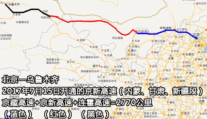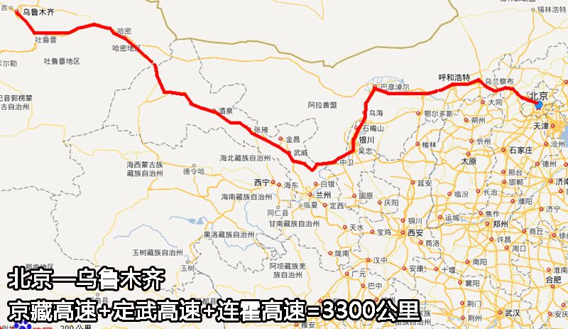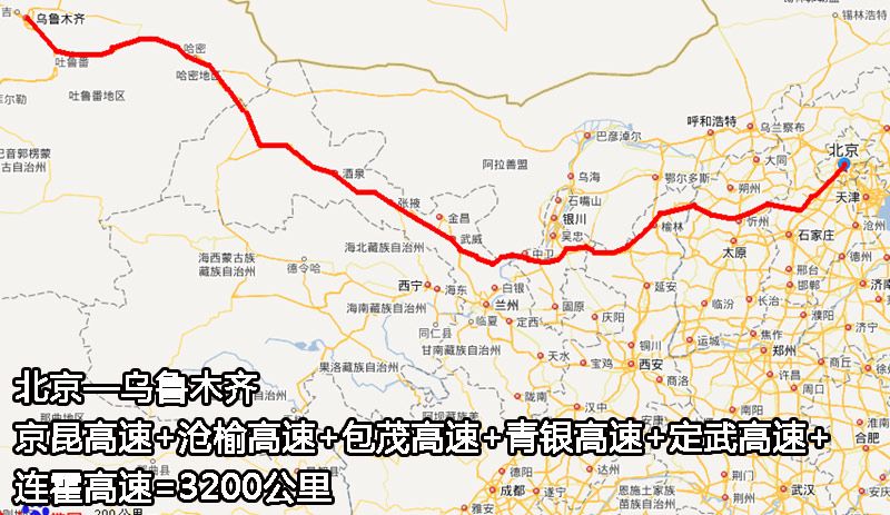 高速公路越来越多,从北京前往新疆,就不一定非得走内蒙了。比如下图红线所标的路,走的是山西忻州、陕西榆林、宁夏中卫,起止点与上述相同,里程约3200公里,缩短100公里。
