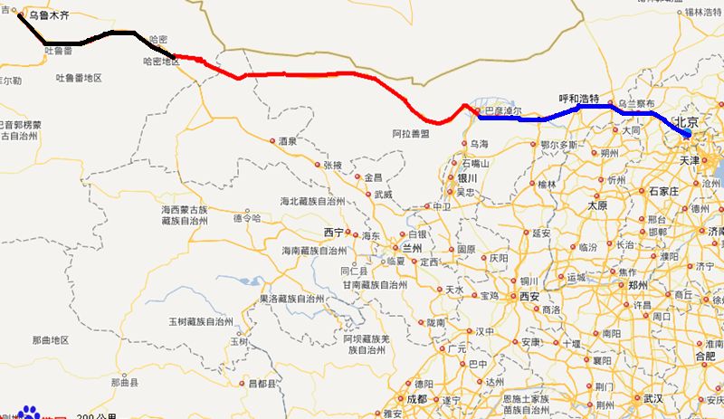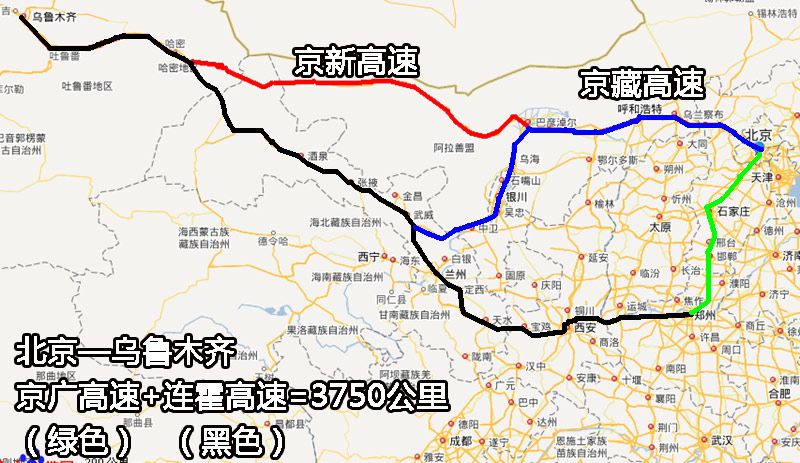 都说京新高速将北京与新疆之间的距离,缩短了1300公里,我将自己5次驾车从北京到新疆的里程记录翻出来,左算右算,至多节省了四五百公里。不知道新闻报道里的1300公里,是怎么计算的——有人说是根据绕行郑州算出来的(下图中绿线+黑线),但即使按故意绕这么大一圈计算,也不过节约1000公里,而不是1300公里。何况,对于京津地区的人来说,完全没必要绕行郑州,除非另有原因。