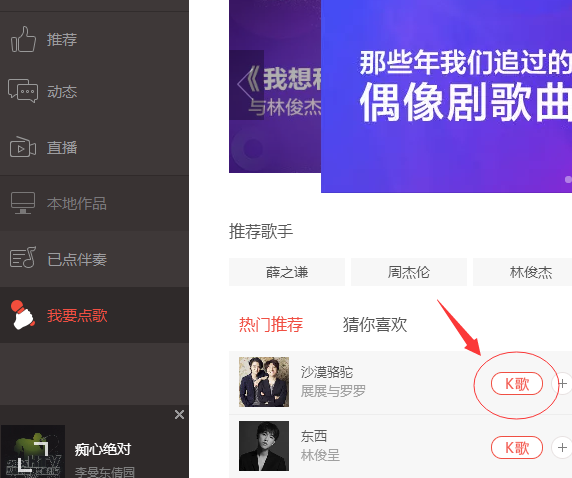 b、进入点歌平台,搜索歌单或者选择自己喜欢的歌后点击“K歌”。