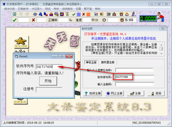 3.运行压缩包中的《打字高手》文录考核8.3注册机.exe,将软件注册界面上的序列号如图中的241717498输入到注册机软件序列号中