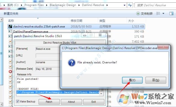 5、将破解补丁davinci.resolve.studio.15b4-patch.exe复制到达芬奇15安装目录,运行补丁,点击patch,选择"是"