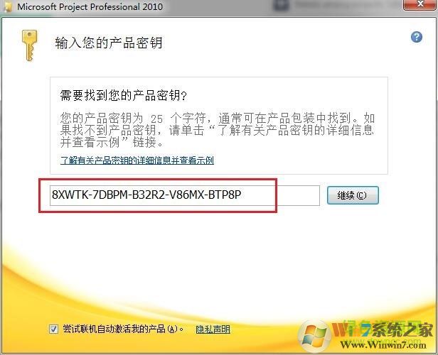 2.会提示要您输入产品密钥(如下图),输入小编下放提供的project 2010密钥(这里以8XWTK-7DBPM-B32R2-V86MX-BTP8P为例子)。