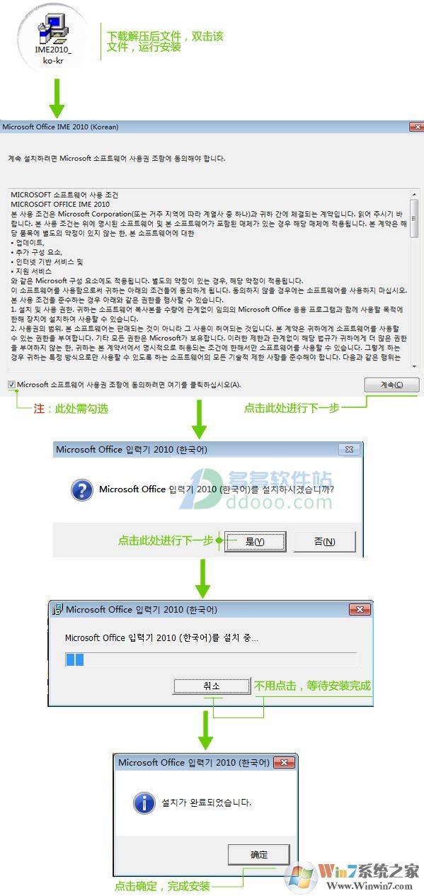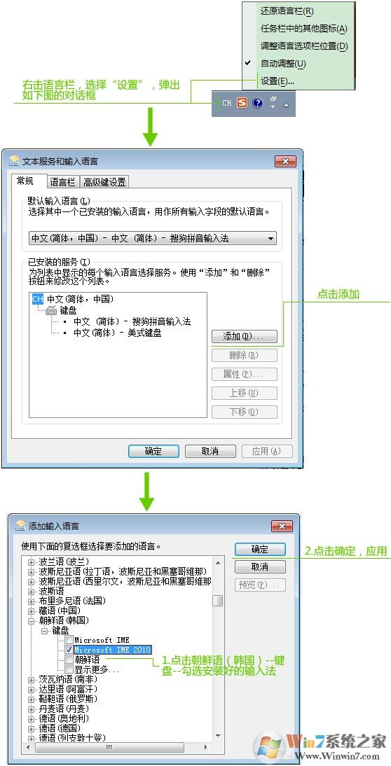 c、然后在打开的小窗口中,选择朝鲜语(韩国),下方键盘勾选安装好的“Microsoft IME 2010”,点击确定;