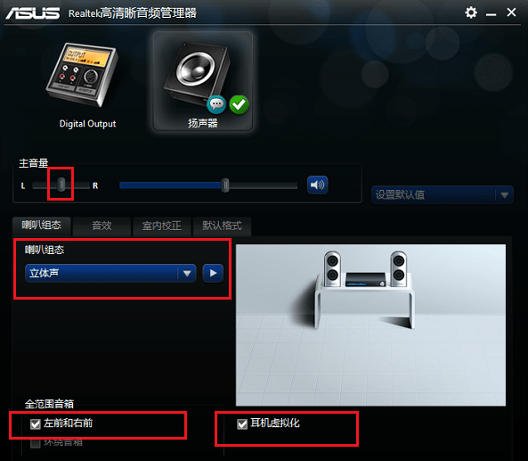 3、组态的话主要是主音量设置为平衡,音量根据需要设置,设置为立体声,勾选左前和右前,如果带了耳机,可以勾选耳机虚拟化。