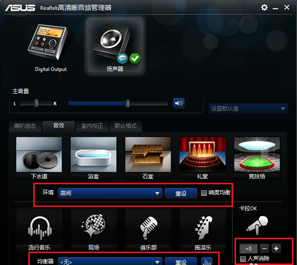 4、进行音效设置,音效主要设置环境和均衡器,这里环境设置为房间,均衡器设置为无,人声消除一般不勾选,卡拉ok设置为0。