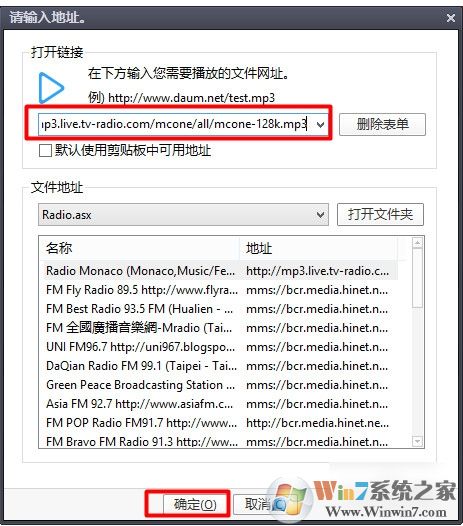 点击播放器窗口,从弹出的右键菜单中依次选择“打开”项,此时将展开“打开”子菜单项,从中选择相应的子项即可实现视频的播放操作。如图所示,当我们选择“打开链接”项时,将弹出如图所示的窗口,在此直接粘贴要播放的视频文件地址,点击“确定”即可进行在线视频观看操作。