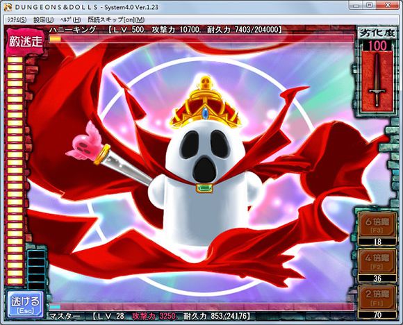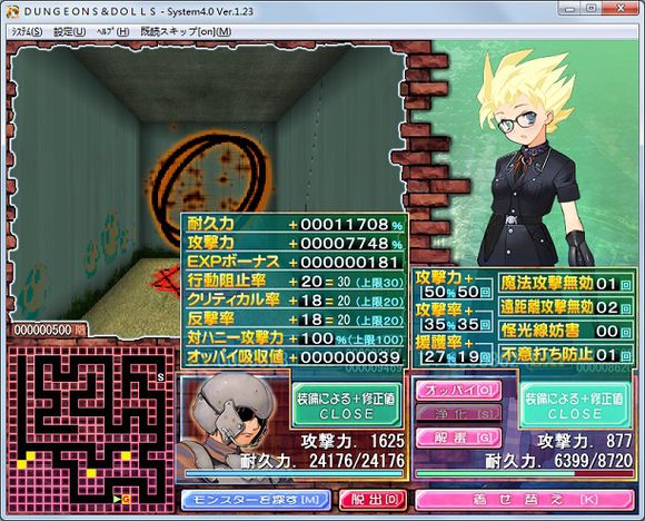 而武器劣化度限制了攻击次数,也就是说,主角只能攻击50次而已,204000÷50=4080,也即是说只要主角的攻击力能达到四千以上就能赢了。不过我刷干净了一百层也刷不出那么高的攻击力,所以在武器劣化后只能依赖人偶的攻击了。