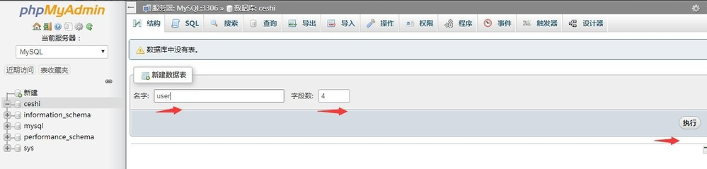 4、新创建的数据库是没有表的,在创建完成数据库后可以直接创建表,填写表名及字段个数点击创建进入创建表结构页面。