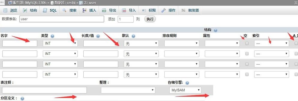 5、在创建表结构页面需要填写表结构的详细信息,名称、类型、长度、索引、自增等信息。