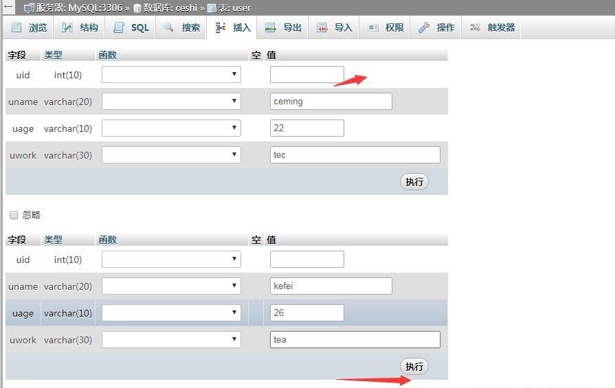 ==表创建完成后点击菜单插入功能可以向表中插入数据,如下图因为第一个字段是主键所以序号是自动增加。