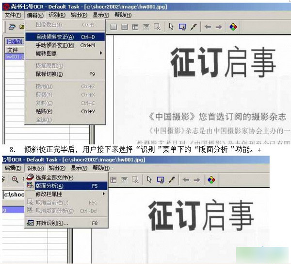 7. 请用户选择尚书7号软件中的“编辑”菜单下的“自动倾斜校正”,让尚书7号软件对扫描进来的图像作相应的旋转,以保证图像中的文字是水平排列,而非倾斜。因为太过倾斜的文字,将影响到尚书软件的识别效果。