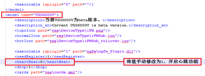 3.发布版本中防火墙的心跳功能,默认是关闭的,安装完毕eNSP后,找到eNSP安装目录下的res\items.xml 里面model名为USG6000V的节点,将heartbeat节点的值手动改为1,开启防火墙心跳功能,然后重启eNSP。