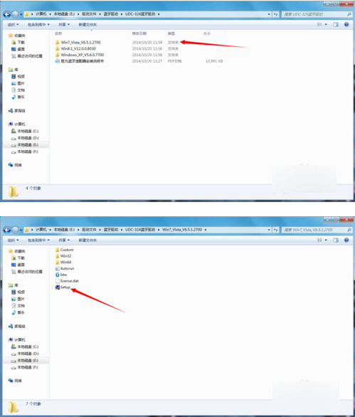 首先打开这个蓝牙适配器附带的驱动光盘,选择WIN7文件夹打开,双击运行文件夹里面的Setup.exe安装运行程序。(切记在安装驱动之前一定不要把蓝牙适配器插入电脑,一定要先动行驱动程序)
